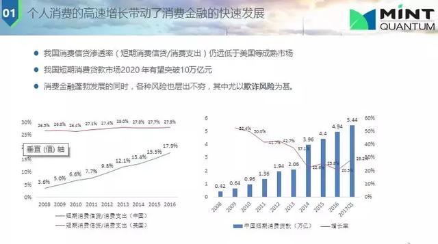 美國(guó)是個(gè)人消費(fèi)實(shí)力很強(qiáng)的一個(gè)國(guó)家,我們以它為標(biāo)桿。圖中藍(lán)線代表中國(guó),紅線代表美國(guó)。預(yù)測(cè)中國(guó)短期個(gè)人貸款到2020年達(dá)10萬億元,可見市場(chǎng)龐大。個(gè)人消費(fèi)不僅僅靠大銀行,還要靠其他小型機(jī)構(gòu);因?yàn)榇筱y行本身這種特點(diǎn)(客群優(yōu)質(zhì)),很難下放到下層服務(wù)。在信用風(fēng)險(xiǎn)中欺詐風(fēng)險(xiǎn)在我國(guó)占的比例非常高,數(shù)額也比較大,經(jīng)常是有組織的欺詐,如做“網(wǎng)絡(luò)黑產(chǎn)”有百萬級(jí)人員,市場(chǎng)規(guī)模為千億級(jí),很多公司被迫無法經(jīng)營(yíng),據(jù)估計(jì),互聯(lián)網(wǎng)金融一半以上的壞賬風(fēng)險(xiǎn)來自欺詐風(fēng)險(xiǎn)。對(duì)比美國(guó)這方面比例就相對(duì)小的很多,如一個(gè)千億級(jí)個(gè)人消費(fèi),中能達(dá)20-30億美元,美國(guó)則只有幾千萬美元。原因有一點(diǎn)是美國(guó)征信做的比較好,幾乎覆蓋所有成年人。反欺詐就是提高欺詐的成本。