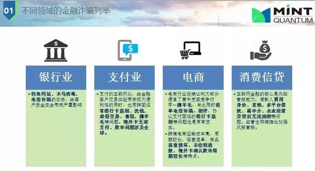 接下來介紹下不同領(lǐng)域的金融欺詐類型,如銀行業(yè)釣魚網(wǎng)站,木馬病毒,做一個(gè)假的網(wǎng)站;電商行業(yè)促銷讓利大部分便宜了黃牛黨或競(jìng)爭(zhēng)對(duì)手—薅羊毛,與此同時(shí)退單電信詐騙,刷評(píng),協(xié)議支付面臨的銀行卡盜刷等問題也是常有發(fā)生;消費(fèi)信貸中借款人冒用身份、老賴、多平臺(tái)借款、黑中介、企業(yè)經(jīng)營(yíng)異常貸后無法跟蹤等問題。