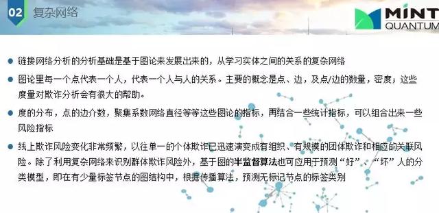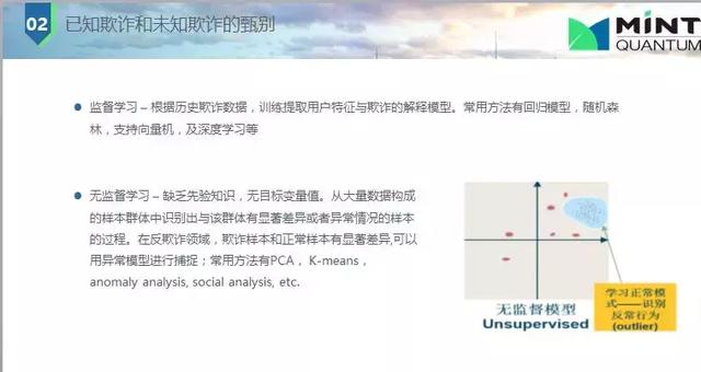 下面是欺詐與未知欺詐甄別問題,主要是監(jiān)督學(xué)習(xí)和非監(jiān)督學(xué)習(xí)。監(jiān)督學(xué)習(xí)是知道一個(gè)人以前欺詐(父母信息不對(duì),電話號(hào)碼有誤等),我們就會(huì)打上標(biāo)簽,歷史數(shù)據(jù)就會(huì)訓(xùn)練我們的模型,統(tǒng)計(jì)模型所用數(shù)據(jù)大都都是有標(biāo)簽的;非監(jiān)督學(xué)習(xí)也是經(jīng)常使用的,因?yàn)槠墼p是經(jīng)常改變的或不同特征的,我并不知道他是否是欺詐,我們用關(guān)聯(lián)網(wǎng)絡(luò),每個(gè)人間有聯(lián)系,這種網(wǎng)絡(luò)快速發(fā)展;還有一種是兩者結(jié)合起來,利用權(quán)重評(píng)估。
