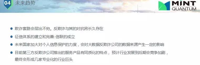 對(duì)未來一點(diǎn)展望,欺詐永遠(yuǎn)不會(huì)停止、不會(huì)消失,尤其在中國(guó)征信沒有完全建立,人口多,社會(huì)缺乏金融知識(shí),對(duì)征信了解很少,收入差距比較大的環(huán)境下,欺詐現(xiàn)象會(huì)長(zhǎng)期存在,這在風(fēng)控里面是考慮的一個(gè)重要部分。征信體系的建立和完善,雖然這個(gè)過程會(huì)很長(zhǎng);目前第三方反欺詐公司推出的服務(wù)產(chǎn)品有同質(zhì)化的特點(diǎn),預(yù)計(jì)行業(yè)發(fā)展到后期會(huì)競(jìng)爭(zhēng)加劇,最終會(huì)形成幾家專業(yè)化的行業(yè)巨頭。