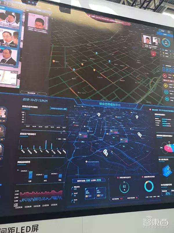 這面墻分四個(gè)部分組成,包括(圖上)一套AR全景地圖指揮控制,能讓用戶通過可視化界面進(jìn)行攝像頭畫面間的轉(zhuǎn)換與調(diào)配;
