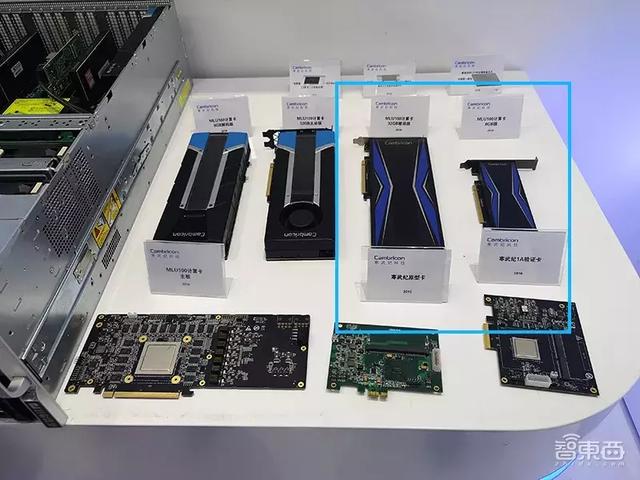 兩款基于MLU100云端AI芯片打造的新計(jì)算卡(圖中藍(lán)框),與上代相比優(yōu)化了散熱性能,在板卡上取消了散熱風(fēng)扇。據(jù)寒武紀(jì)工作人員介紹,右邊的8GB版計(jì)算卡比左邊的32GB版減少了視頻編解碼模塊,可應(yīng)用于AI語音語義場景。